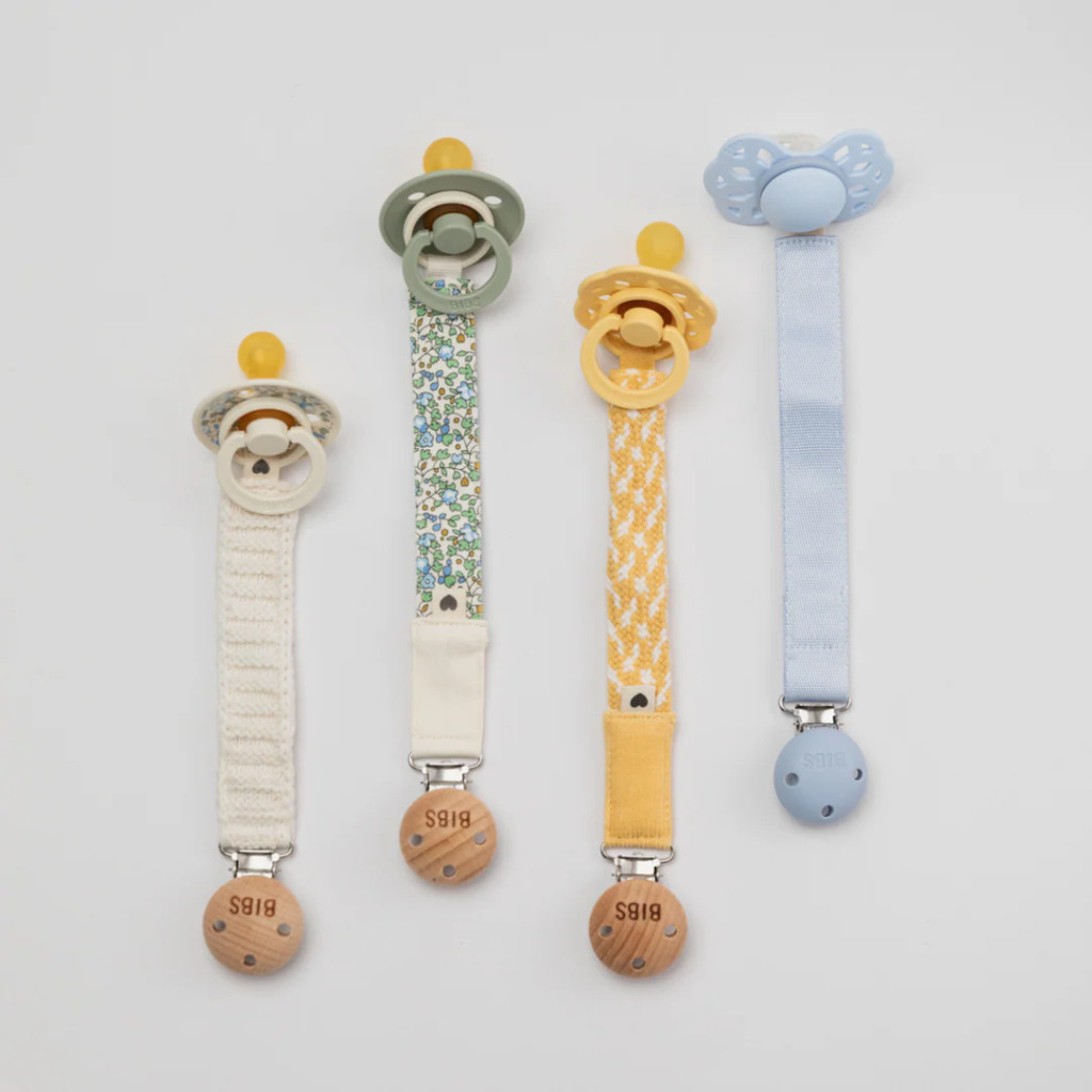 A BIBS szalag cumilánc praktikus és elegáns megoldás, amely megakadályozza, hogy a cumi leeszen vagy elveszítse helyét. A puha, zsályazöld textilszalag kényelmes viseletet biztosít, miközben a strapabíró csipesz biztonságosan rögzíti a cumit a ruhához. A természetes színvilág bármilyen babakelengyéhez könnyen illeszkedik.