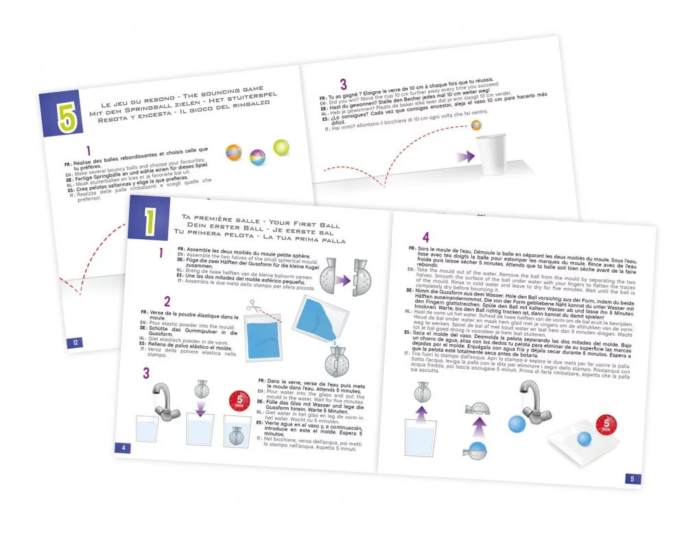 A dobozban 5 féle rugalmas, nyúlékony alapanyag és egy színes, illusztrált útmutató füzet található. A kísérletek során készíthetsz klasszikus pattogó labdát, színes labdát, kocka alakú labdát vagy épp fluoreszkáló változatot. Ha elkészültek, próbáld ki őket ügyességi játékokban is!