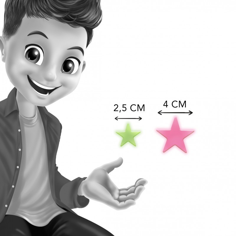 Varázsold a szobát csillagos égbolttá! A BUKI foszforeszkáló csillagok a falra vagy a mennyezetre ragaszthatók, és néhány perc fényhatás után akár egy órán keresztül világítanak a sötétben. A csomagban 50 darab csillag található két méretben (2,5 cm és 4 cm), így változatos és hangulatos dekoráció készíthető belőlük.