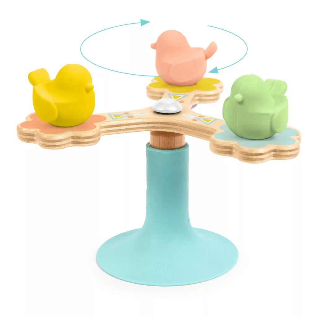 Fából és szilikonból készült, pasztell színű forgó játék tapadókoronggal, amely fejleszti a szem-kéz koordinációt és az érzékszerveket. A három madár egy kézlökéssel hosszasan forog a golyóscsapágy rendszernek köszönhetően. Tapadókorongja stabilan rögzíthető sima felületekre, biztonságos és könnyen használható.