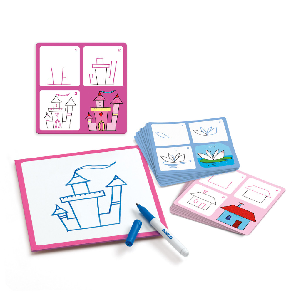 A rajzolás most igazi élmény lehet! A Djeco Step by Step Joséphine and Co készletben a gyerekek sablonkártyák segítségével lépésről lépésre tanulhatják meg a rajzolás alapjait, miközben kedves figurákat és hercegnőket alkotnak. A letörölhető tábla és filctoll biztosítja, hogy a rajzolás bármikor újrakezdhető legyen, így a gyakorlás sosem okoz frusztrációt – csak örömteli alkotást.