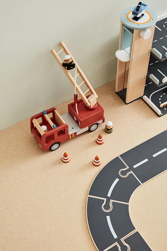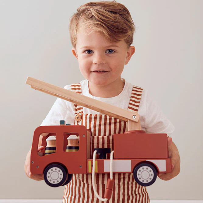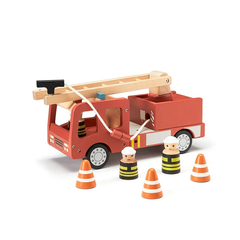 – Tartalom: fa tűzoltóautó + játékkiegészítők (pl. létra, tömlő, bóják/tűzcsap)