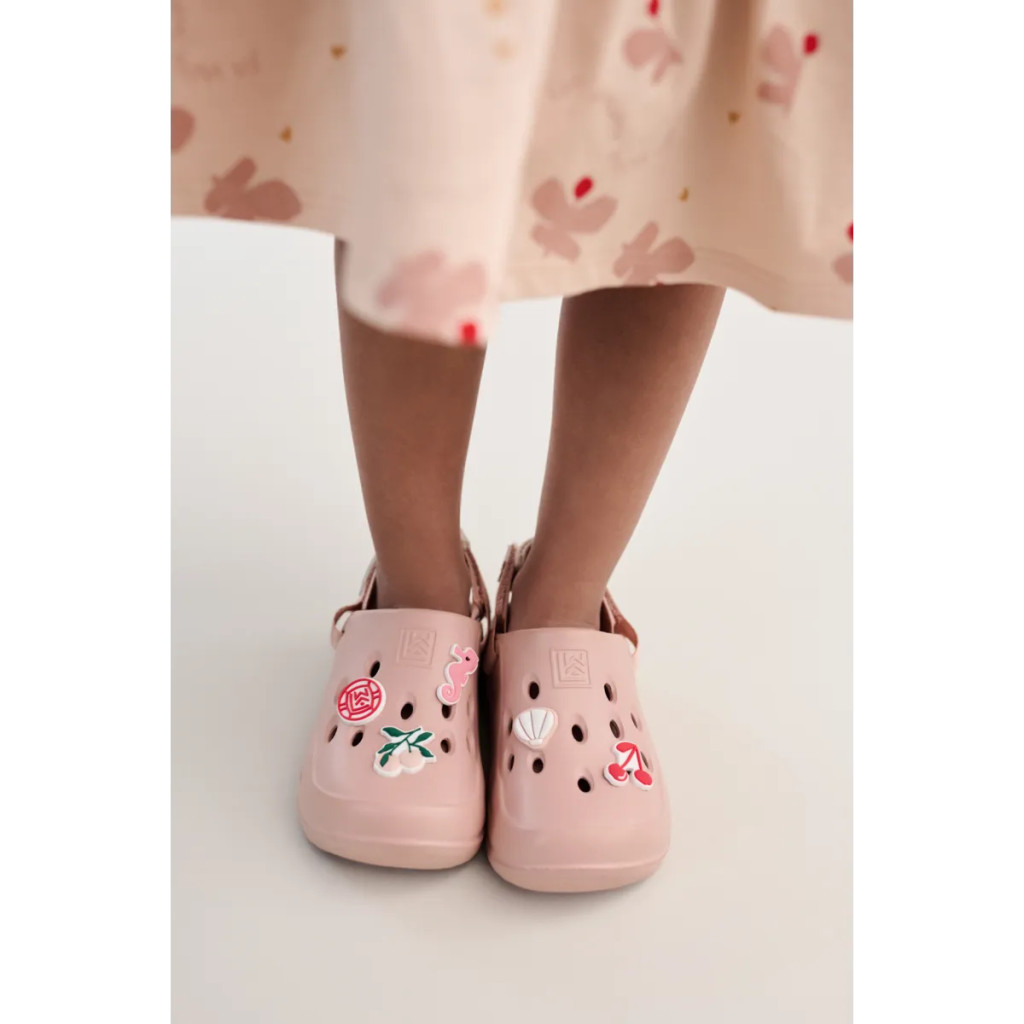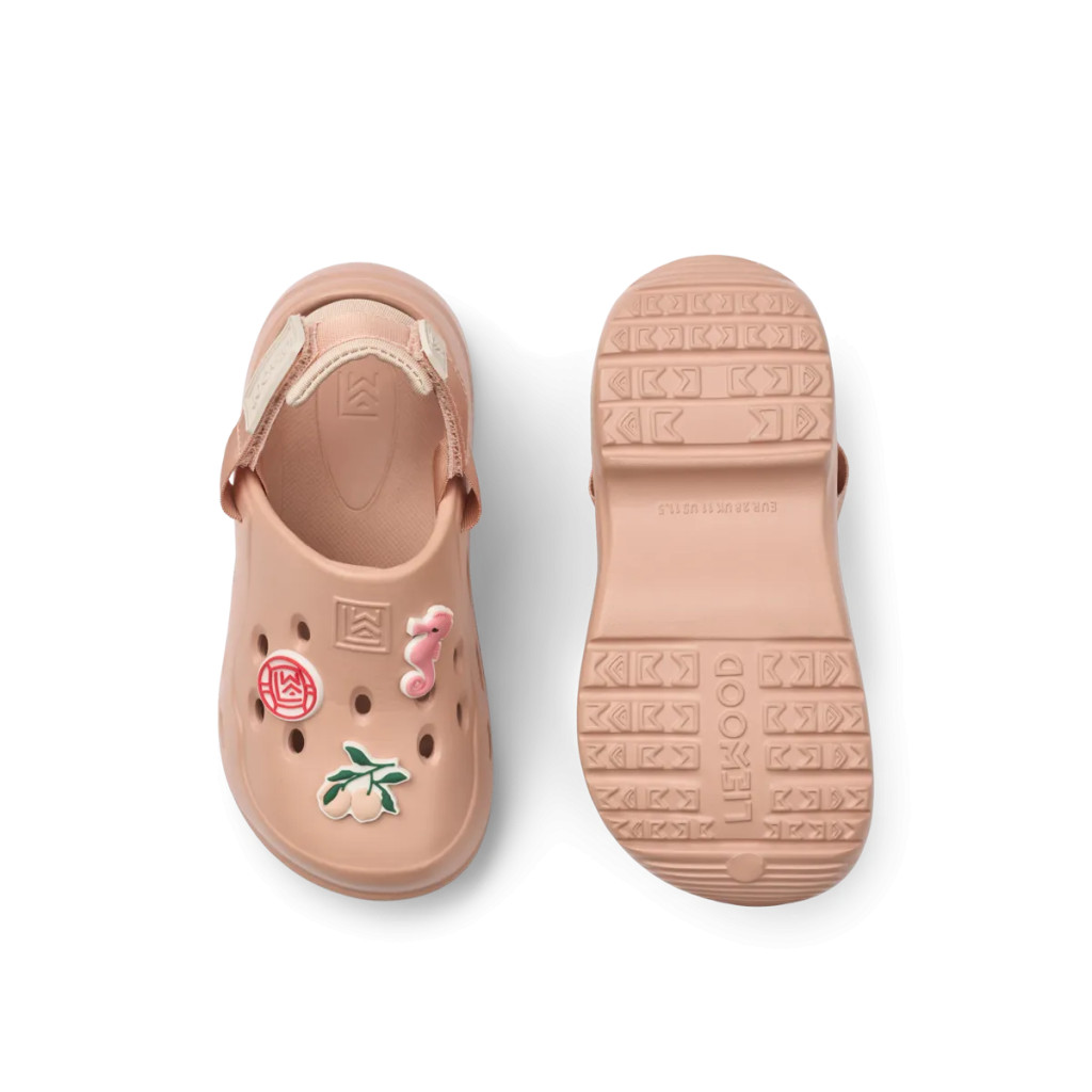 A szandált díszítő, Liewood ikonikus formáit idéző charmok szabadon áthelyezhetők, így a gyerekek saját ízlésük szerint alakíthatják a megjelenést. Az állítható sarokpánt segít a tökéletes illeszkedésben, míg a párnázott sarokrész extra kényelmet nyújt egész napos viselet során. A zárt orrkialakítás védi a lábujjakat, a szellőzőnyílások pedig gondoskodnak a megfelelő légáramlásról.