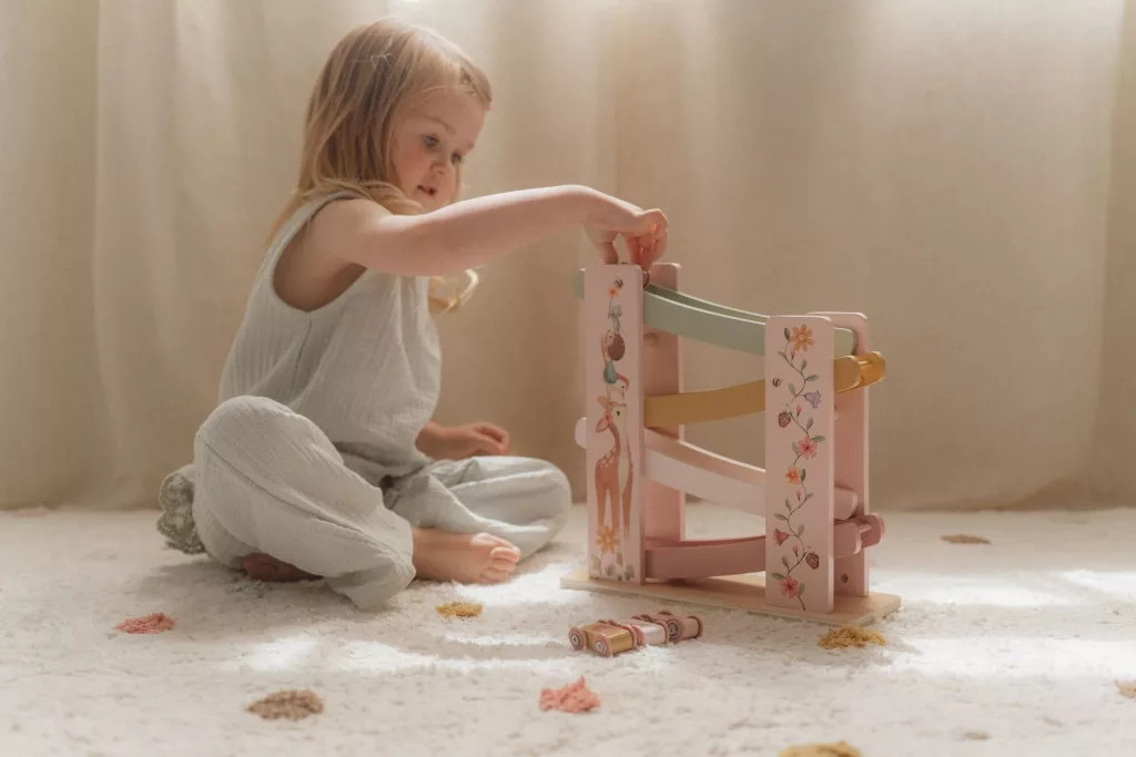 Kezdődjön a verseny a tündérkertben! Ez a csodaszép, virág- és állatmintás fa autópálya egy igazi kaland a legkisebbeknek – ahol a versenyautók helyét most sündisznók, pillangók, katicák és madarak veszik át. A kisautók felülről indulnak, majd egymás után száguldanak végig a lejtőkön, izgalmas köröket írva le, miközben a gyerekek ámulva figyelik a mozgásukat.