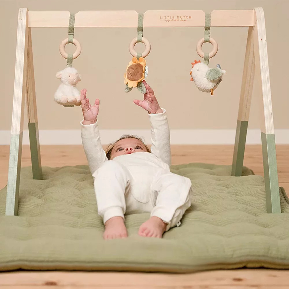 A Little Dutch babatornáztató stabil fa vázzal és három színes, levehető plüssfigurával remek szórakozást és fejlődést kínál a legkisebbeknek. Az állványról lógó figurák azonnal felkeltik a baba figyelmét, így először csak nézegeti őket, majd egyre ügyesebben nyújtózkodik feléjük, fejlesztve ezzel a szem-kéz koordinációját.