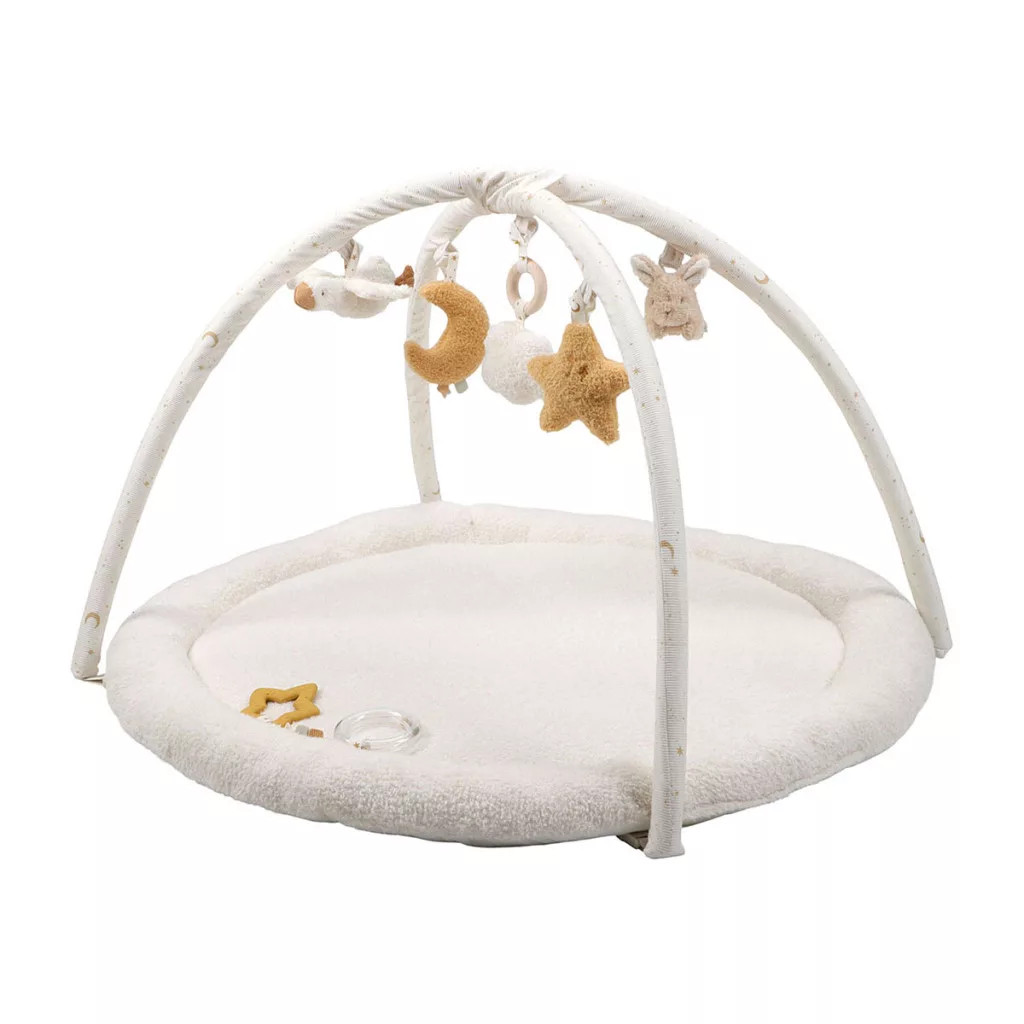 Egy varázslatos kis világ, amely biztonságos alapot nyújt a baba első felfedezéseihez. A Little Dutch Newborn Naturals játékhidas játszószőnyeg puha, párnázott felületével kényelmes helyet biztosít játékhoz és pihenéshez egyaránt. A játékhídon lógó bájos figurák, susogó részek és különböző textúrák játékosan ösztönzik a kicsit a tapintásra, nyújtózkodásra és a világ megismerésére.
