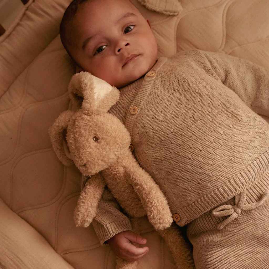 A Baby Bunny kollekció kedves nyuszija igazi első barát, aki már újszülött kortól biztonságosan ölelhető. Pihe-puha bundája és hosszú fülei megnyugtató közelséget adnak, így ideális alvótárs, de nappal is hűséges játszótárs. Letisztult, természetes színei bármely babaszobába tökéletesen illenek, és örömteli hangulatot teremtenek.