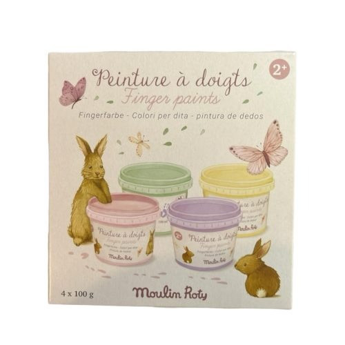Finom, pasztell árnyalatú ujjfesték készlet a Moulin Roty „Rózsababák” kollekciójából, amely gyengéd színeivel és könnyen kenhető állagával ideális első alkotóélmény a legkisebbeknek.
