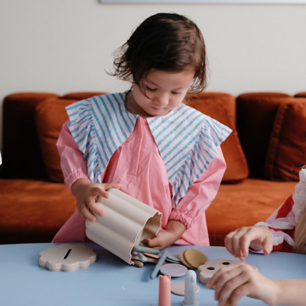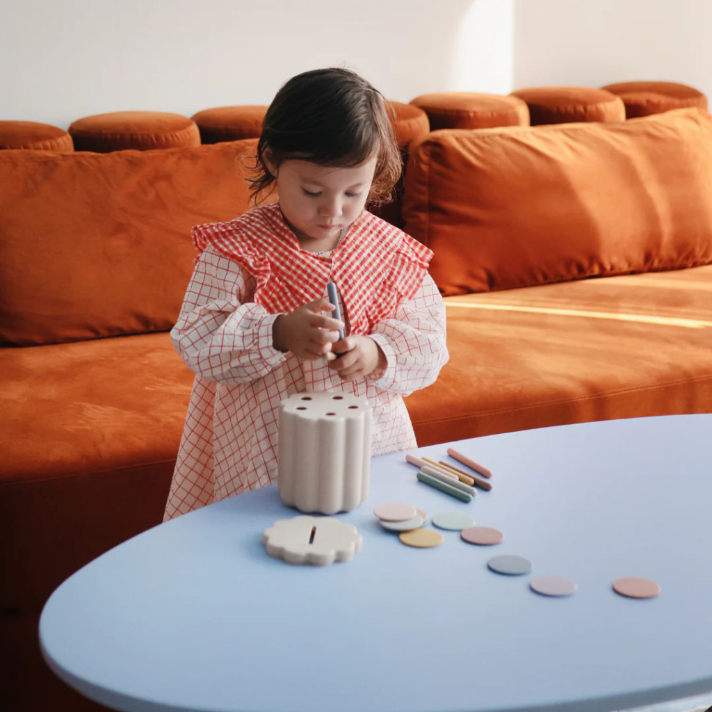 A Mushie formabedobó szett klasszikus, fejlesztő játék, amely elősegíti a baba kézügyességének, kéz-szem koordinációjának és problémamegoldó képességének fejlődését. A szett egy formákkal díszített pálcát és különböző formájú, színes érméket tartalmaz, amelyeket a baba a megfelelő nyílásokba helyezhet. Természetes, biztonságos anyagokból készült, így nyugodtan hagyhatod játszani vele a legkisebbeket is.