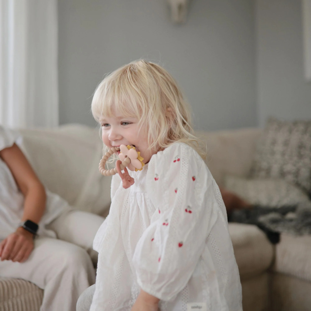 A Mushie Gyöngy rágóka puha, BPA-mentes szilikon gyöngyökből áll, amelyek gyengéden masszírozzák a baba érzékeny ínyét a fogzás időszakában. A természetes, natúr árnyalat visszafogott és időtálló megjelenést biztosít, miközben a könnyű kialakításnak köszönhetően a kicsik könnyen megfoghatják és rágcsálhatják. A gyöngyök biztonságos anyagból készültek, így a rágóka ideális választás a fogzási kellemetlenségek enyhítésére.