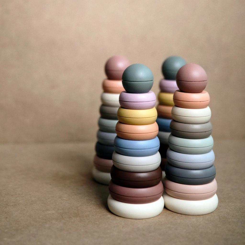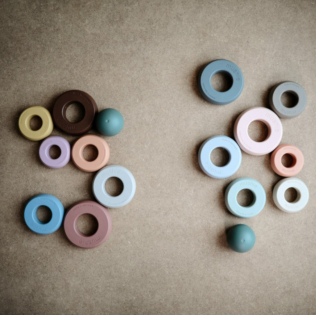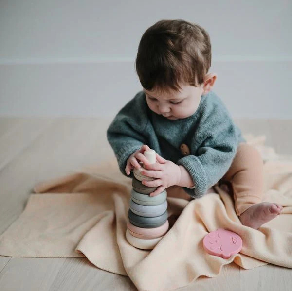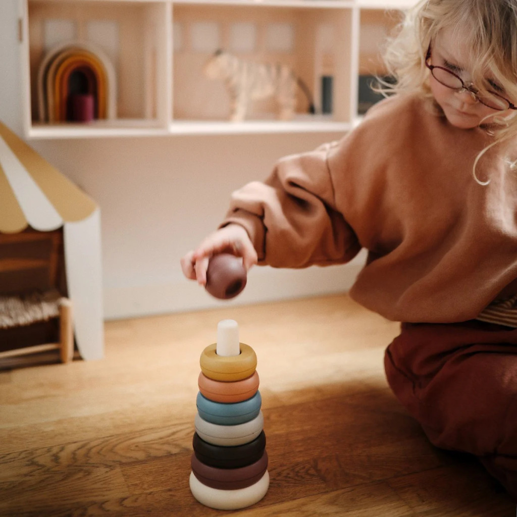 A Mushie Gyűrű piramis egy klasszikus fejlesztő játék, amely elősegíti a baba finommotorikus képességeinek, kézügyességének és színfelismerésének fejlődését. A puha, BPA-mentes szilikon gyűrűk különböző méretűek és pasztell árnyalatokban pompáznak, így könnyen egymásra helyezhetők a stabil torony kialakításához. A természetes színek és anyagok harmóniája biztonságos és esztétikus játékélményt nyújt.