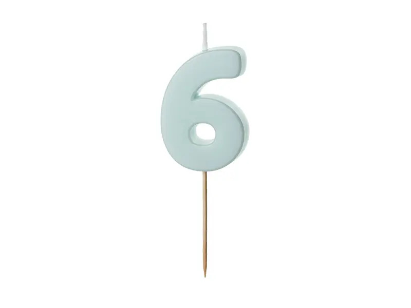 6-os számgyertya világoskék színben, kb. 5,5 cm magas.