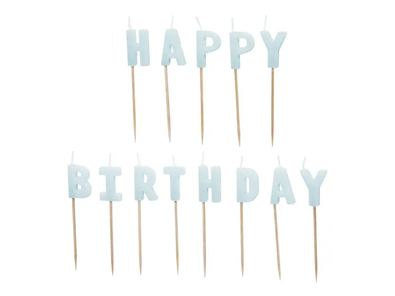 Világoskék „Happy Birthday” feliratú tortagyertya, kb. 2,5 cm magas, 13 darabos készlet.