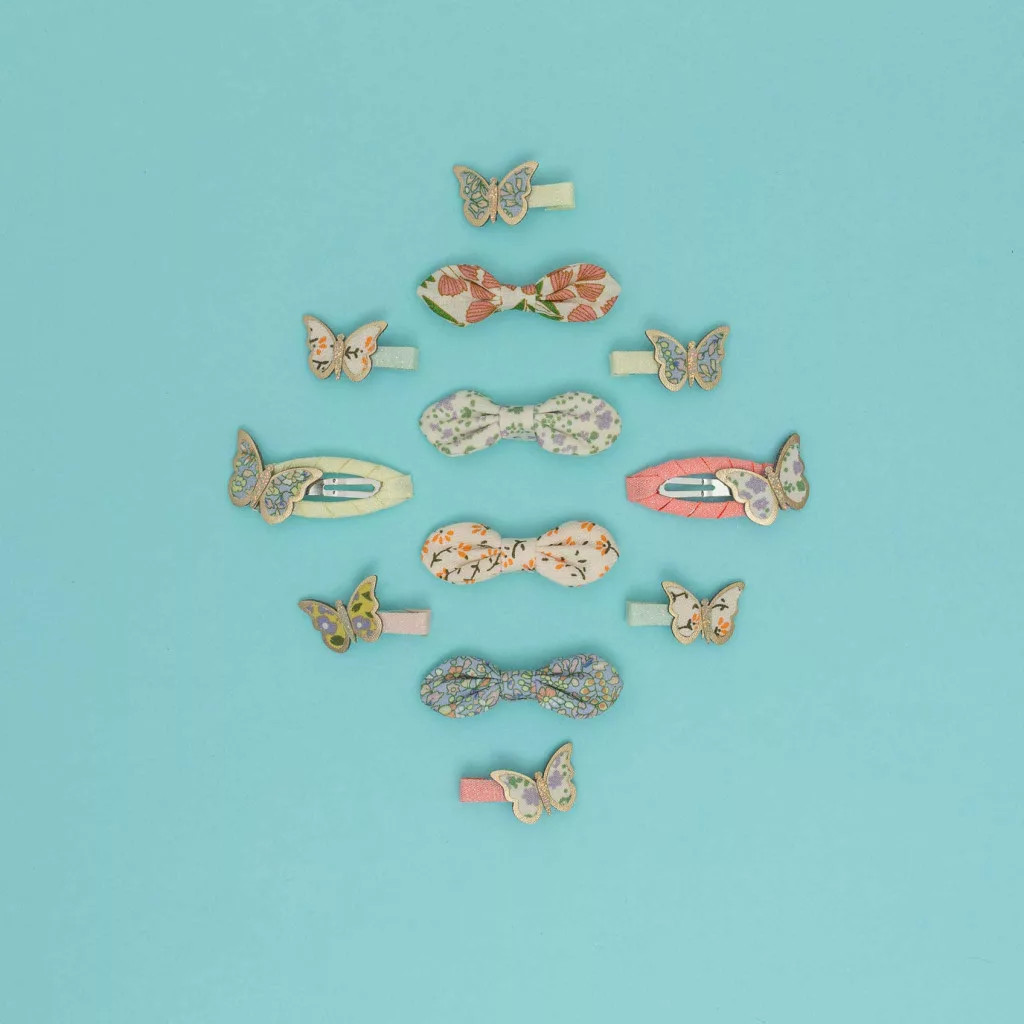 A Virágos pillangós mini csatok - 8 db-os szett könnyed, vidám hangulatot csempész a frizurába. Az arany szegéllyel díszített, finom pillangók színes alapokon kapnak helyet, így apró méretük ellenére is igazán látványos kiegészítők.