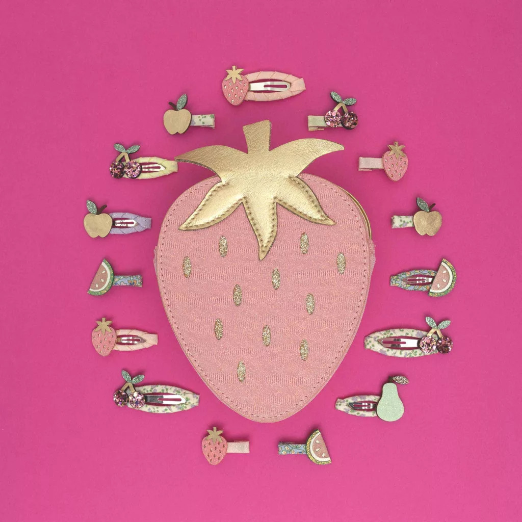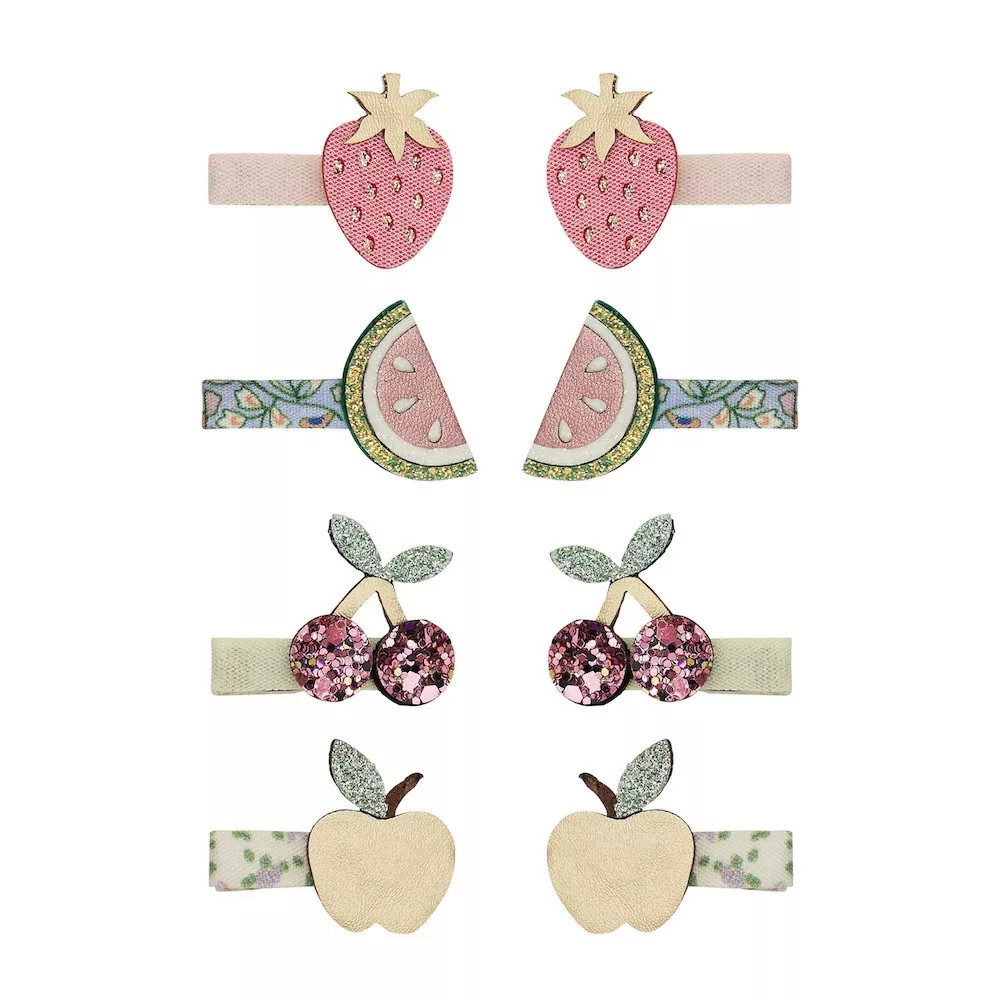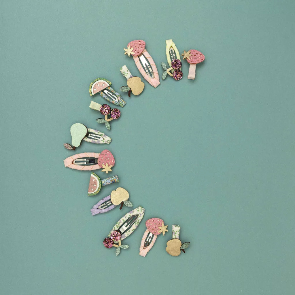 A Gyümölcssalátás mini klipszek - 8 db-os szett üde, színes hangulatot visz a frizurákba. A játékos, gyümölcsös díszítések igazi nyári frissességet sugároznak, így tökéletes választás minden kisgyermek számára, aki szereti a vidám, különleges hajkiegészítőket.