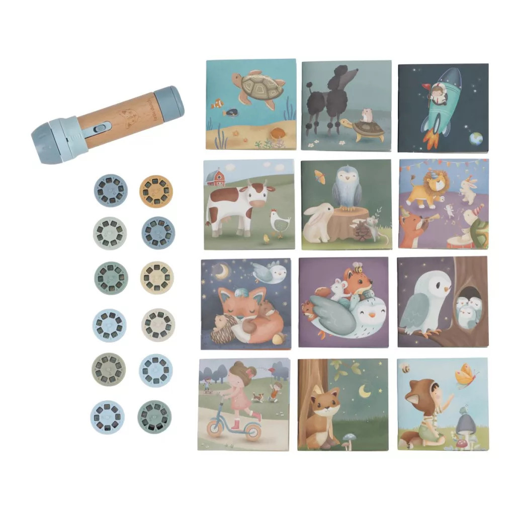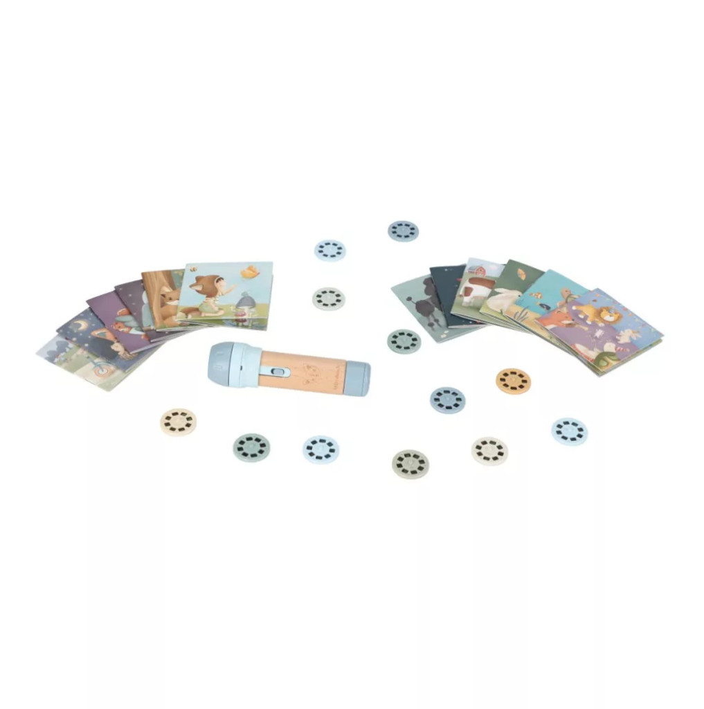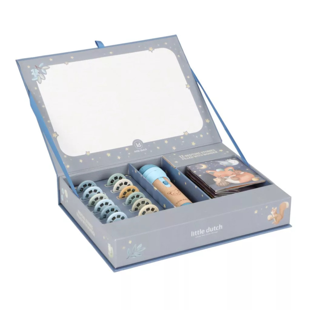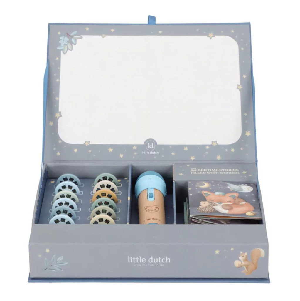 A Little Dutch mesevetítővel az esti mesélés igazi varázslatos élménnyé válik. Ez a különleges, kék színű zseblámpa 12 vetítőkorongot tartalmaz, mindegyiken egy-egy saját történettel és gyönyörű illusztrációval. A képeket a falra vagy a mennyezetre vetítve a gyerekek egy mesés világba csöppenhetnek, ahol minden este új kaland vár rájuk.